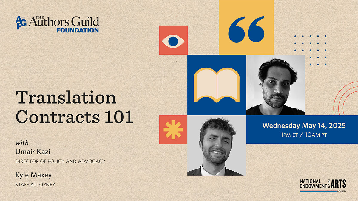 Join us for an overview of literary translation contracts with the Authors Guild’s director of policy and advocacy, Umair Kazi, and staff attorney, Kyle Maxey. We will discuss the key elements to look for in a book deal and suggest negotiating points for translators.