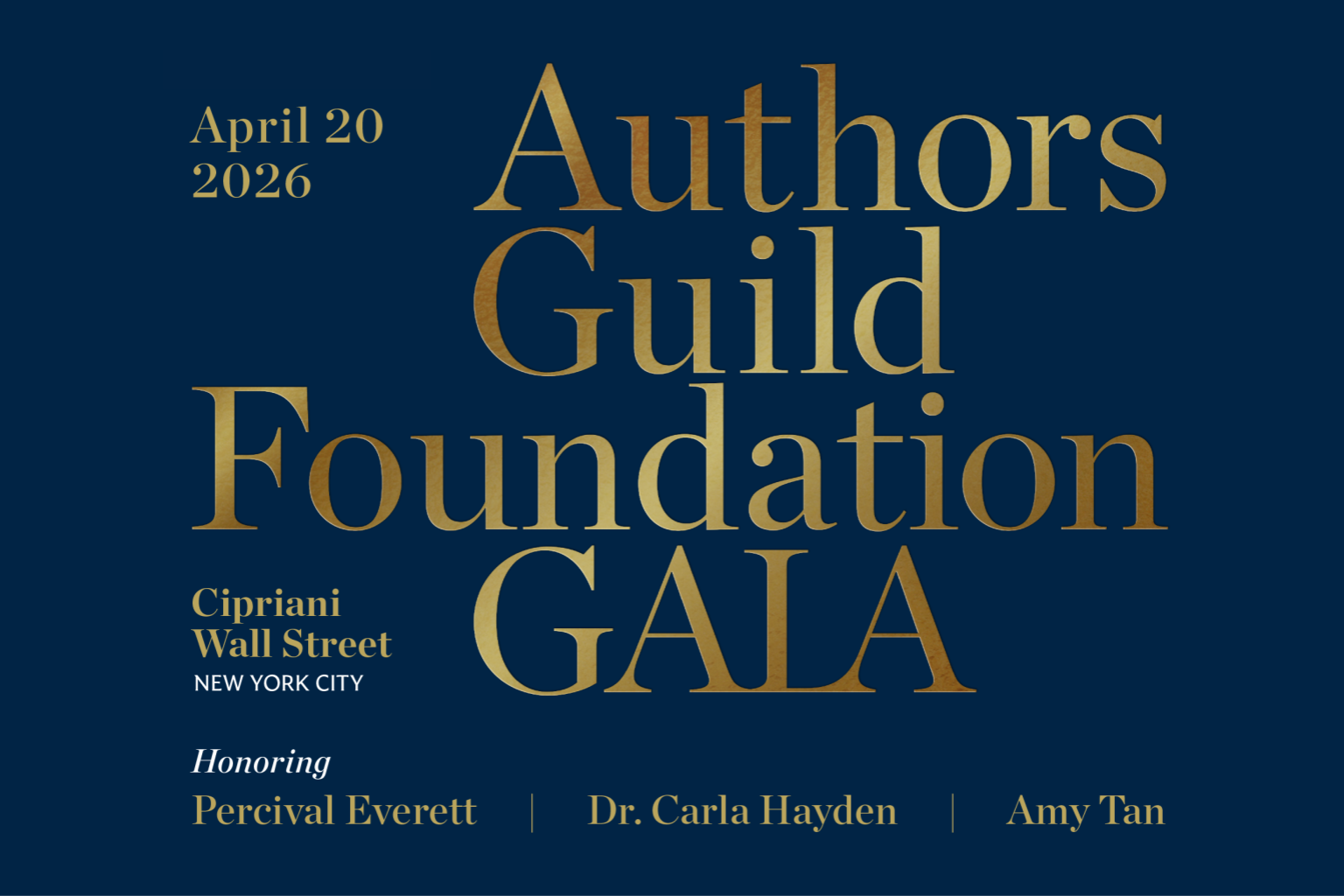 2026 Authors Guild Foundation Gala Share on Twitter (opens in a new tab) on Facebook (opens in a new tab) on Linkedin (opens in a new tab) via email Cipriani Wall Street55 Wall Street, NYC 6 P.M. VIP Reception · 6:30 P.M. General Reception7:30 P.M. Dinner & Program · 9:30 P.M. After PartyBlack Tie Optional Celebrate with us on Monday, April 20, 2026, at Cipriani Wall Street as we honor Percival Everett, Dr. Carla Hayden, and Amy Tan at the Authors Guild Foundation Gala. This unforgettable evening raises vital funds for the Foundation’s programs and advocacy, protecting writers’ rights, combating censorship, and fostering a vibrant landscape for readers and writers alike. TICKETS SPONSOR JOURNAL ADS SUPPORT Honoring Percival Everett Baldacci Award for Literary Activism Dr. Carla Hayden Champion of Writers Award Amy Tan Preston Award for Distinguished Service to the Literary Community Special Guests Cord JeffersonAcademy Award-Winning Writer and Director Christian CooperEmmy Award-Winning Television Host and Bestselling Author Honorary Chair Dakota JohnsonActor and Producer 2026 Sponsors History Sponsors Suzanne Collins & Charles Pryor · Spotify for Authors Novel Sponsors Charleston Literary Festival · Hachette Book Group · HarperCollins Publishers · Penguin Random House Anthology Sponsors Audible · Books-A-Million · Lesher Family Foundation · Macmillan Publishers · Sourcebooks Biography Sponsors Marie Arana & Jonathan Yardley · Brisa & Mark Carleton · Patti Callahan Henry · Leon Levy Foundation · Susanna Porter & James Clark · RBmedia · Karyn Schoenbart, Duo Partners · Scholastic Inc. · Simon & Schuster · R.L. & Jane Stine · Writers House Click here to learn about sponsorship opportunities. 2026 Gala Committee Co-Chairs Marie Arana · Brisa Carleton · Patti Callahan Henry · Meredith LesherHonorary Co-Chair: Christina Baker Kline Lucy Ferriss · Amity Gaige · Steph Opitz · Vanessa LeFebvre · Susanna Porter · Jessica Shattuck · Joanna Stone · Randy Winston