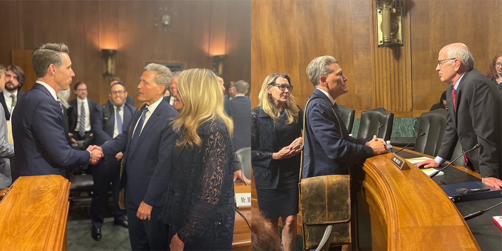 Left: Rasenberger and Baldacci speak with Senator Josh Hawley, chair of the Senate Judiciary Subcommittee on Crime and Counterterrorism. Right: Rasenberger and Baldacci speak with Senator Peter Welch.